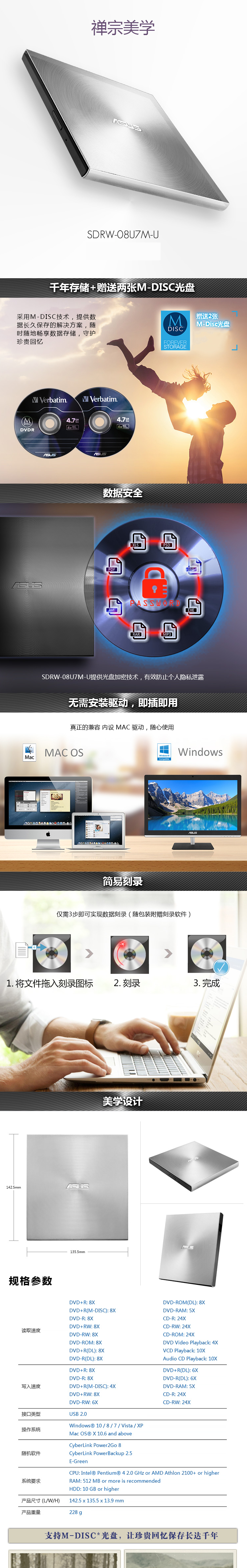 华硕(ASUS) 8倍速 USB2.0 外置DVD刻录机 移动光驱 银色